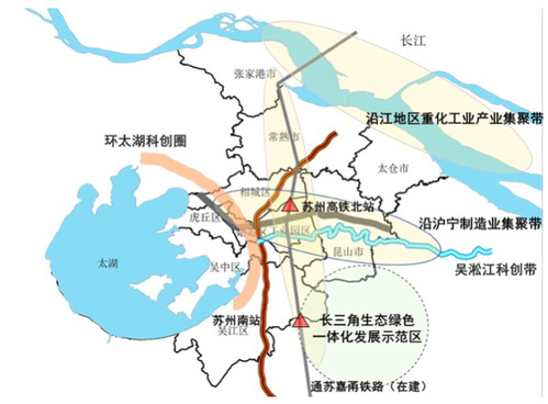 制造业是苏州的一大优势,长期以来,沿着东西向沪宁线和南北向苏嘉杭两条轴线发展,其中沿沪宁制造业集聚带,是目前苏州创新要素投入密度最大、经济发展最活跃、产业基础最雄厚、创新能力最强劲的产业集聚带。近年来,又形成了一条沿江地区重化工业集聚带。随着相城发展的崛起,在推动两条东西向制造业集聚带向产业创新集群建设转型过程中,要科学研判和超前谋划苏州未来空间格局演变,而如何让新生和潜在增长空间,强化与东西向两条制造业集聚带形成空间协同互补,对建设更具优势的产业创新集群具有重要意义。
