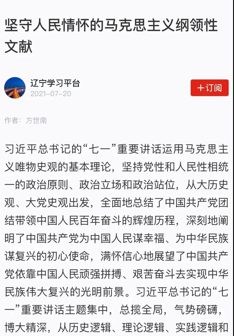 【编者按】习近平总书记的“七一”重要讲话是一篇充分彰显党的坚定信念、根本宗旨和优良作风,体现以人民为中心、坚守人民情怀的马克思主义纲领性文献。近日,“学习强国”转载了东吴智库首席专家方世南教授的观点文章《坚守人民情怀的马克思主义纲领性文献》,该文从人民情怀源于对党与人民关系的科学认识、党的初心使命的不懈践行、治党强党的坚强决心三个方面,详细论述了坚守人民情怀的内涵与重要性。现将全文转载如下,以飨读者。