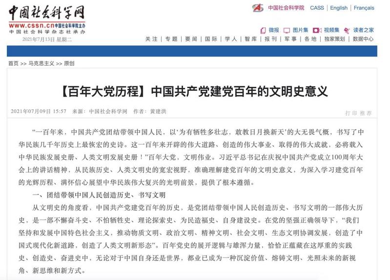 中国社会科学网|智库专家话百年:中国共产党成立百年的文明史意义