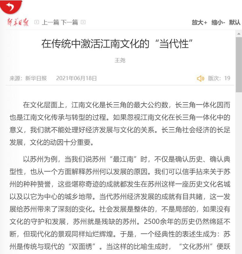 【编者按】锦绣江南,苏州尤最。为积极响应苏州市委市政府关于《“江南文化”品牌塑造三年行动计划》,苏州大学东吴智库组织专家积极开展“江南文化”专题研究,重点聚焦江南文化的挖掘与保护、展示与呈现、转化与发展、传播与推广,努力使苏州成为“江南文化”的核心叙述者、传播者和引领者,提升苏州在“江南文化”话语体系中的首位度和辐射力。近日,东吴智库与新华传媒智库合作推出“江南文化”专版,解读如何重塑“最江南”的文化之魂,系列文章先后被交汇点、新江苏等平台转载。现将专版首篇《在传统中激活江南文化的“当代性”》转载如下,以飨读者。