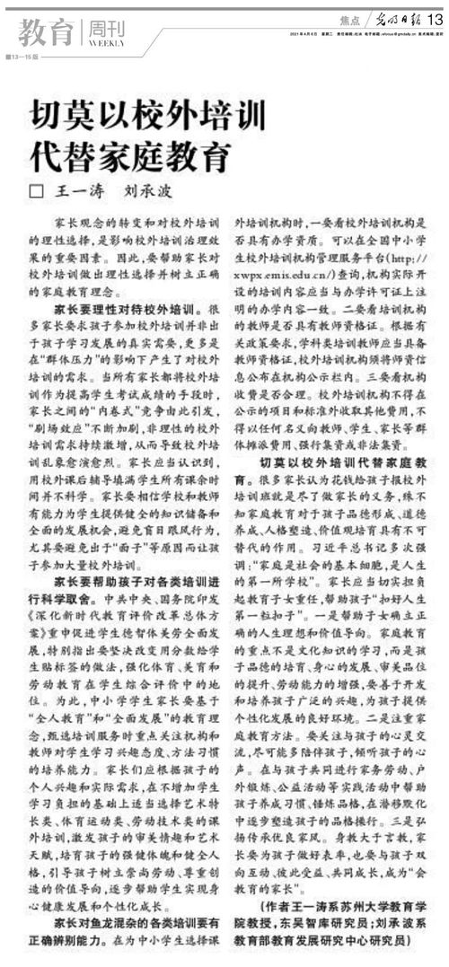 光明日报等 | 王一涛等:切莫以校外培训代替家庭教育