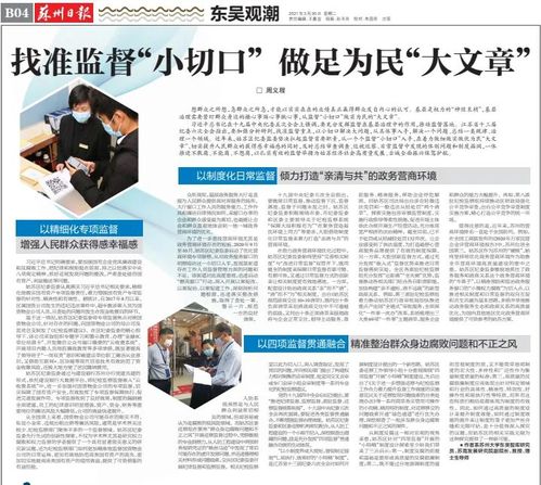 【编者按】近日,《苏州日报》“东吴观潮”栏目刊登了东吴智库研究员周义程教授的文章《找准监督“小切口”,做足为民“大文章”》,从“精细化专项监督、制度化日常监管、四项监督通融合”三个方面找准监督“小切口”,为姑苏经济社会高质量发展、古城全面振兴保驾护航。现将全文转载如下,以飨读者。