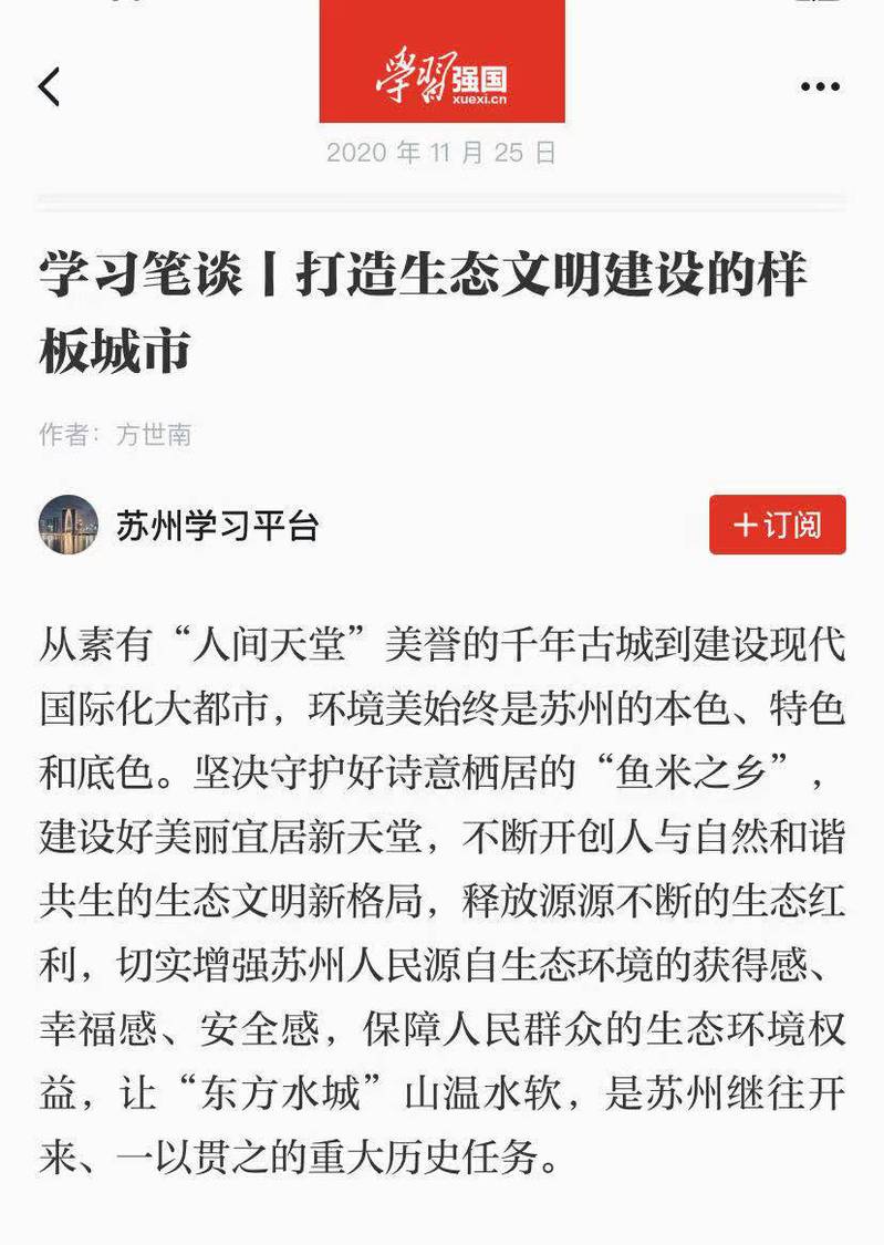 【编者按】2020年11月25日,“学习强国”学习平台刊载东吴智库首席专家、苏州大学特聘教授、博士生导师方世南的观点文章《打造生态文明建设的样板城市》。文章指出,切实增强苏州人民源自生态环境的获得感、幸福感、安全感,保障人民群众的生态环境权益,让“东方水城”山温水软,是苏州继往开来、一以贯之的重大历史任务。现将全文转载如下,以飨读者。