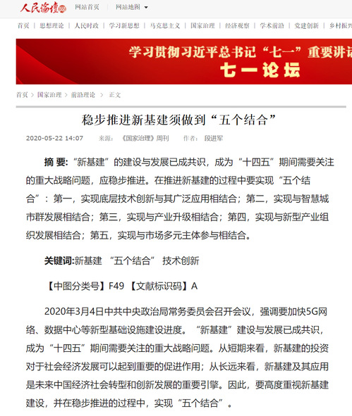 2020年3月4日中共中央政治局常务委员会召开会议,强调要加快5G网络、数据中心等新型基础设施建设进度。“新基建”建设与发展已成共识,成为“十四五”期间需要关注的重大战略问题。从短期来看,新基建的投资对于社会经济发展可以起到重要的促进作用;从长远来看,新基建及其应用是未来中国经济社会转型和创新发展的重要引擎。因此,要高度重视新基建建设,并在稳步推进的过程中,实现“五个结合”。