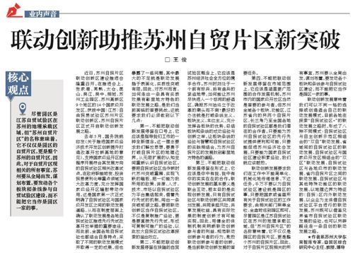 【编者按】3月17日,《苏州日报》“苏报智库”栏目刊登东吴智库研究员王俊的文章《联动创新助推苏州自贸片区新突破》。文章指出,对于自贸片区现相关的所有事宜,苏州要从全局出发,谋划布置,要发动各个板块和条线参与自贸试验区建设。现将全文转载如下,以飨读者。