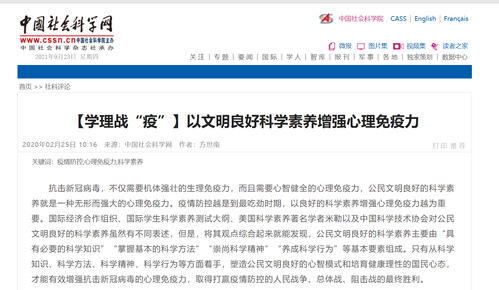 【编者按】新型冠状病毒肺炎疫情发生以来,党中央、国务院高度重视,习近平总书记作出一系列重要指示批示。苏州市委坚决贯彻落实习近平总书记重要指示批示精神,按照中央和省委各项部署要求,第一时间动员和组织各级各部门以及广大党员群众立即行动起来,有力有序有效开展疫情防控阻击战。东吴智库积极落实要求、响应号召。针对新型冠状病毒肺炎疫情防控工作,智库学者开展理论探索与政策建言,助力科学防治、精准施策,构筑好群防群治的严密防线,坚决打赢疫情防控阻击战。近日,中国社会科学网刊登东吴智库首席专家方世南的文章《以文明良好科学素养增强心理免疫力》,现将全文分享如下。