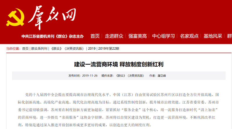 【编者按】中国共产党第十九届中央委员会第四次全体会议提出要提高城市治理现代化水平。东吴智库研究员屠立峰副教授立足苏州实际情况,阐释苏州建设一流营商环境,释放制度创新红利的重要现实意义。原文刊登于中共江苏省委主办的《群众》(决策资讯版)2019年第22期,现将全文转载如下,以飨读者。