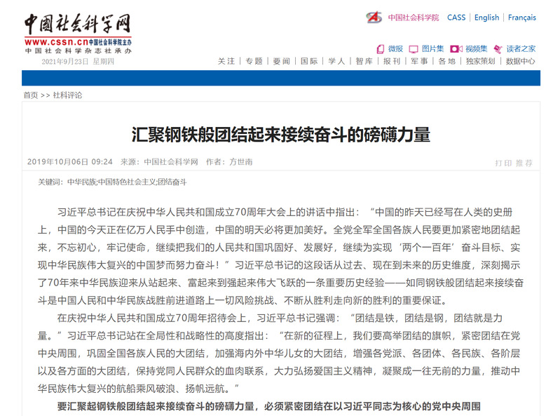 习近平总书记在庆祝中华人民共和国成立70周年大会上的讲话中指出:“中国的昨天已经写在人类的史册上,中国的今天正在亿万人民手中创造,中国的明天必将更加美好。全党全军全国各族人民要更加紧密地团结起来,不忘初心、牢记使命,继续把我们的人民共和国巩固好、发展好,继续为实现‘两个一百年’奋斗目标、实现中华民族伟大复兴的中国梦而努力奋斗!”习近平总书记的这段话从过去、现在到未来的历史维度,深刻揭示了70年来中华民族迎来从站起来、富起来到强起来伟大飞跃的一条重要历史经验——如同钢铁般团结起来接续奋斗是中国人民和中华民族战胜前进道路上一切风险挑战、不断从胜利走向新的胜利的重要保证。