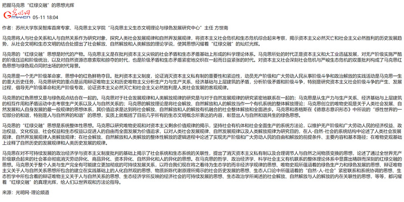 马克思在对不可持续发展的政治经济学与资本主义制度批判的基础上揭示了社会系统和生态系统的关联性,提出了消灭资本主义私有制以及合理调节人与自然之间物质变换的思想,论述了通过全世界无产阶级联合起来的社会革命彻底消灭劳动异化、商品异化、资本异化、自然异化和人的异化的思想。在马克思的哲学、政治经济学、科学社会主义有机联系的整体理论体系中显露出精辟而深刻的红绿交融的思想。马克思关于整个人类与生产完全有可能建立更加彻底的可持续发展关系,以符合我们现在将之看待为生态学的而非经济学规律的思想、唯物史观所蕴涵着的绿色生产力和绿色发展的思想、辩证唯物主义关于人与自然关系思想所包含的建立在实践基础上的人化自然观的思想、物质新陈代谢原理所揭示的社会历史发展的思想、生态人口论中所蕴涵着的“自然-人-社会”紧密联系和系统协调的思想、生态哲学中所包含着的辩证唯物主义关于人与自然关系的思想、生态经济学所反映的经济社会的可持续发展的思想、生态政治学所阐述的社会解放、自然解放与人的解放的内在关联性的思想,等等,都闪耀着“红绿交融”的真理光辉,给人们以世界观和方法论指导。