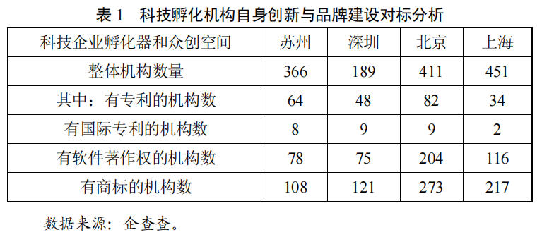 一是为产业创新集群融合发展相配套的科技服务业不够发达。据企查查显示,苏州技术先进型服务企业为64家(其中,49家集中在工业园区),数量多于上海(34家)和深圳(23家),少于北京(125家)。但苏州此类企业规模均较小,注册资本超过1000万美元仅有7家,低于上海(8家)和北京(23家)。此外,各地在科技服务业供应链、产业制造能力、信息流等方面还需加大投入力度和前瞻布局。二是对科技孵化平台创新策源关注不够。苏州现有科技企业孵化器和众创空间366 家,超过深圳(189家),少于北京(411家)和上海(451家)。从总体上看,这些科技孵化机构自身创新能力和品牌建设力还比较薄弱(见表1)。此外,孵化机构所在地政府为科创策源提供资源支持的意愿与能力也有待强化。
