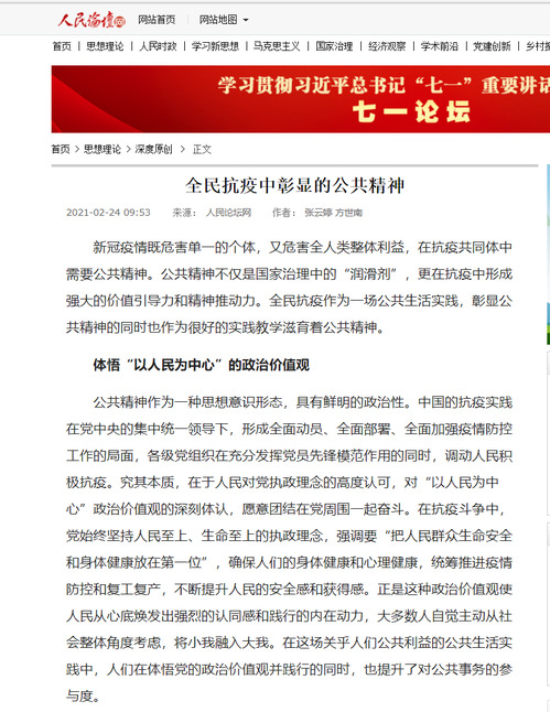 公共精神作为一种思想意识形态,具有鲜明的政治性。中国的抗疫实践在党中央的集中统一领导下,形成全面动员、全面部署、全面加强疫情防控工作的局面,各级党组织在充分发挥党员先锋模范作用的同时,调动人民积极抗疫。究其本质,在于人民对党执政理念的高度认可,对“以人民为中心”政治价值观的深刻体认,愿意团结在党周围一起奋斗。在抗疫斗争中,党始终坚持人民至上、生命至上的执政理念,强调要“把人民群众生命安全和身体健康放在第一位”,确保人们的身体健康和心理健康,统筹推进疫情防控和复工复产,不断提升人民的安全感和获得感。正是这种政治价值观使人民从心底焕发出强烈的认同感和践行的内在动力,大多数人自觉主动从社会整体角度考虑,将小我融入大我。在这场关乎人们公共利益的公共生活实践中,人们在体悟党的政治价值观并践行的同时,也提升了对公共事务的参与度。