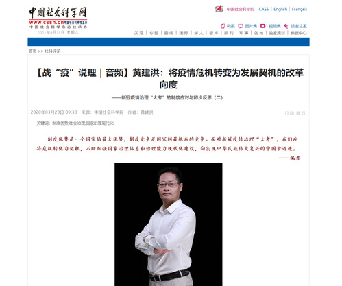 大家好!我是苏州大学东吴智库研究员、政治与公共管理学院教授黄建洪。今天,我们来谈谈新冠疫情治理“大考”的初步反思。我的核心观点是——要将疫情危机转变为发展契机。