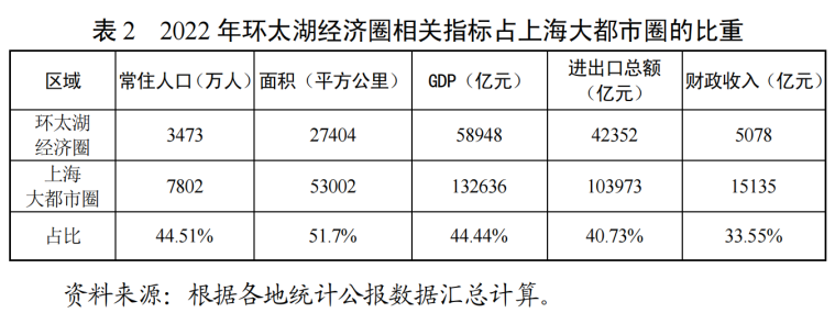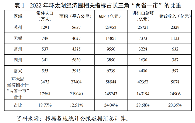 1.长三角一体化向纵深推进的战略空间。长三角一体化重大使命之一就是打破行政区划,实现市场的一体化,为其他城市群发展探索新路、做出表率,这也是习近平总书记寄予长三角一体化的殷切期望。环太湖经济圈作为长三角的核心圈层,是长三角一体化战略向纵深推进最重要的战略空间。表1数据显示,截至2022年末,环太湖经济圈以近20%的常住人口、12.5%的国土面积贡献了长三角“两省一市”近四分之一的 GDP、近30%的外贸和超五分之一的财政收入,在长三角区域中具有举足轻重的地位。此外,环太湖经济圈还处于上海、南京、杭州大三角的重心位置。近年来,随着上海自贸区临港新片区、长三角生态绿色一体化发展示范区、虹桥国际开放枢纽建设三大战略落地实施,标志着长三角在跨区域制度创新方面取得了重大进展。进入新的发展阶段,长三角一体化亟需探寻更广阔的落地空间,而环太湖经济圈正是一个绝佳的战略空间。