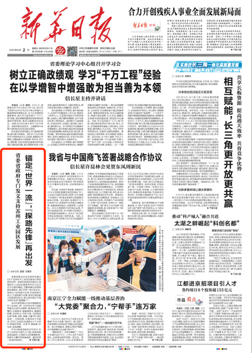 省委常委会会议近期审议通过《关于支持苏州工业园区建设开放创新的世界一流高科技园区的意见》,强调苏州工业园区要始终牢记习近平总书记殷切嘱托,完整准确全面贯彻新发展理念,紧盯世界一流目标定位,坚持以产业创新为引领、科技创新为动力、开放创新为支撑,坚决扛起试验示范的责任担当,努力成为展示中国式现代化的“重要窗口”。