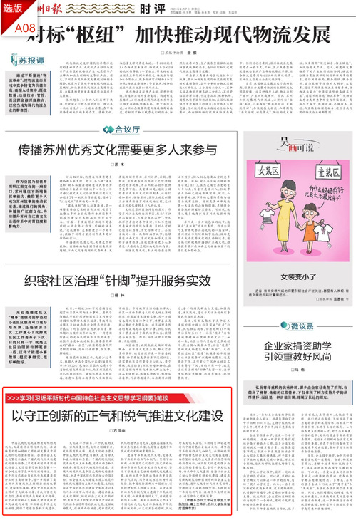 【编者按】《苏州日报》6月7日刊登苏州大学东吴智库首席专家方世南的文章《以守正创新的正气和锐气推进文化建设》。文章基于习近平新时代中国特色社会主义思想,提出文化建设在中国式现代化建设中发挥着重要功能,强调建设中华民族现代文明需要发扬守正创新的正气和锐气。现将全文转载如下,以飨读者。