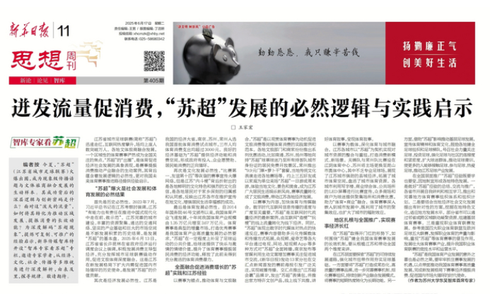 【编者按】《新华日报》2025年6月17日刊登苏州大学东吴智库首席专家、苏州大学体育学院教授王家宏的文章《迸发流量促消费,“苏超”发展的必然逻辑与实践启示》。文章探讨“苏超”火爆出圈,成为现象级传播话题背后的深层逻辑与创新密码。现将全文转载如下,以飨读者。