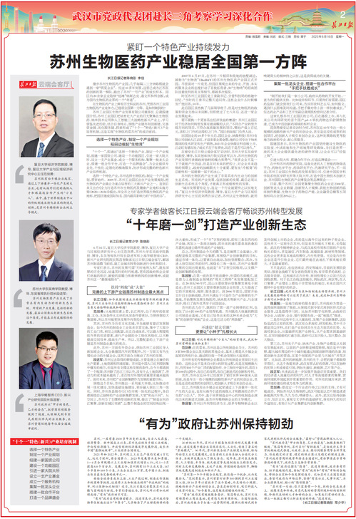 在接受长江日报云端会客厅采访时,段进军认为,苏州生物医药产业发展代表着政府独特的魄力和勇气。“很多企业不是一下子就能产生效益,但是在对未来的把控上、对企业未来趋势的预期上,政府的战略眼光十分重要,要有坐‘冷板凳’的忍耐性和一届接着一届干的决心。”