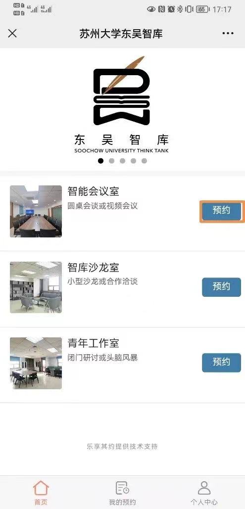 5、东吴智库审核通过后,将通过短信或微信服务号(需关注“乐享其约”)推送预约订单通过提醒,届时申请人可使用“校园一卡通”刷卡进入相关会议室。