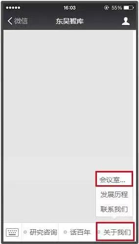 1、关注“东吴智库”微信公众号,点击菜单栏【关于我们】,进入【会议室预约】;