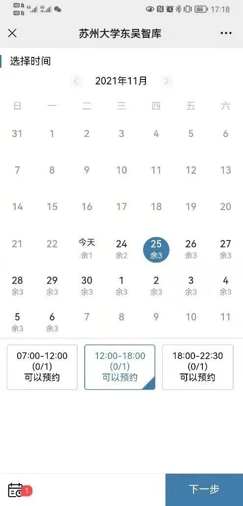 3、选择会议室使用日期和具体时间段,点击【下一步】;