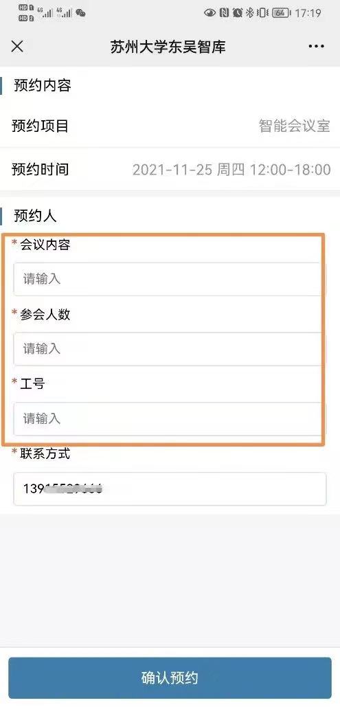 4、填写【会议内容】、【参会人数】、【工号】等信息,并点击【确认预约】