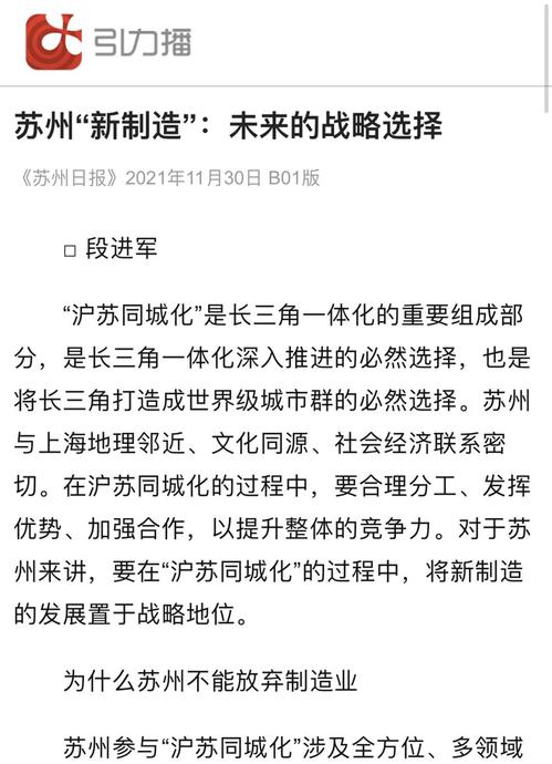 【编者按】近日,《苏州日报》刊登了苏州大学东吴智库执行院长段进军教授的文章《苏州“新制造”:未来的战略选择》,并被引力播转载。作者认为在推进“沪苏同城化”的过程中,新制造应成为战略核心和目标,并指出要从新制造、新战略、新主体、新要素、新空间、新生态和新品牌七个方面充分考虑,才能更好支撑和推动新制造的发展。现将全文转载如下,以飨读者。