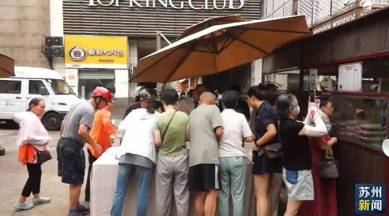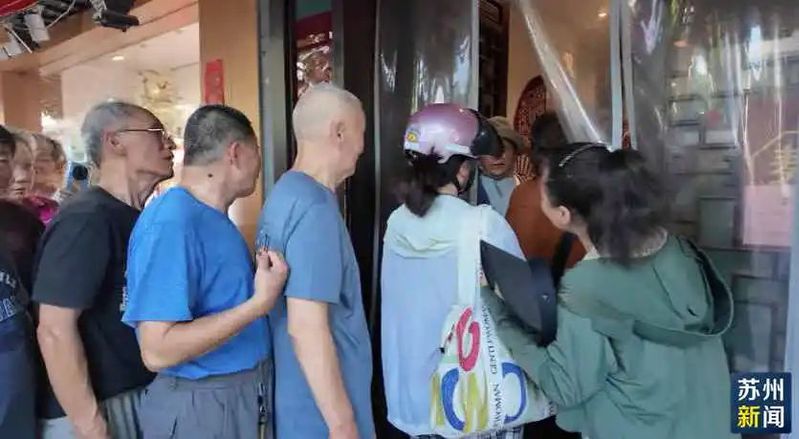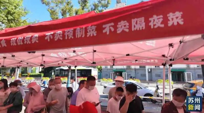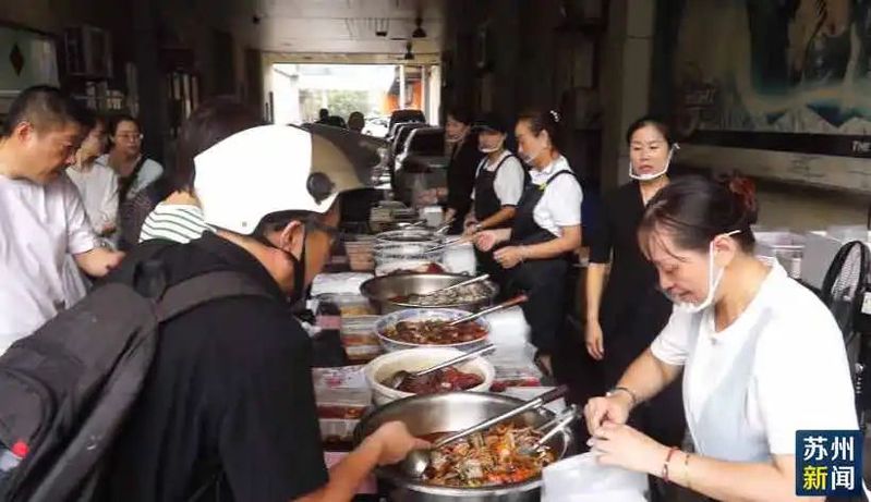 在姑苏区烽火路,电喇叭的边上聚拢了不少老苏州,这里是雅都大酒店的出摊销售点。工作人员忙得额头上在冒汗,衬衫领带还是整整齐齐,星级酒店的派头一点不马虎,不少老苏州也是看准了这点,来尝鲜的。
