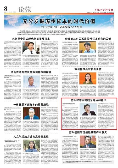 【编者按】近日,《中国社会科学报》刊登苏州大学东吴智库执行院长段进军教授的文章《苏州样本以实践为内涵和特征》。文章聚焦“中国式现代化江苏新实践”,论述了以现代化新实践打造苏州样本的实践内涵和实践特征。现将全文转载如下,以飨读者。