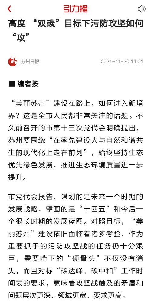 【编者按】打赢污染防治攻坚战,是推进生态文明体制机制创新的重要抓手。苏州多年来始终坚持生态优先绿色发展,在推进生态环境质量进一步提升、率先建设人与自然和谐共生的现代化发展模式方面走在了前列。