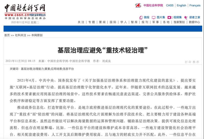 中国社会科学报 | 刘成良:基层治理应避免“重技术轻治理”