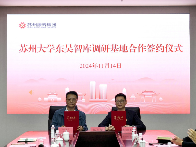 随后,东吴智库秘书长、人文社科处副处长尚书和苏州康养集团办公室主任祖若雄联合签署了合作协议。双方将聚集养老、健康产业等领域开展深入合作,探索智企合作新模式,在推进协同创新中实现互利共赢。