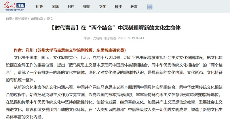 【编者按】9月19日,《光明网》“理论频道”在线刊登苏州大学东吴智库研究员孔川副教授的文章《在“两个结合”中深刻理解新的文化生命体》。文章基于“把马克思主义基本原理同中国具体实际相结合、同中华优秀传统文化相结合”的“两个结合”,从文化内涵、文化形态、文化特征三个维度阐述了“新的文化生命体”的深刻内涵,深化了对文化建设的规律性认识。现将全文转载如下,以飨读者。