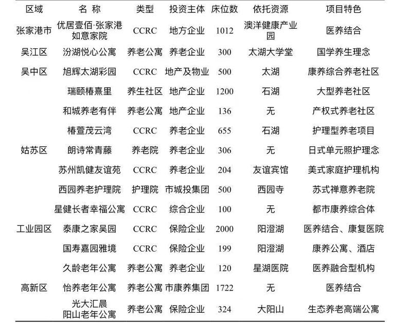 2.产业投资主体多元,高端养老产品业态丰富。目前,苏州已吸引寿险、地产、外资、国资等各类主体投资高端养老产业,产品类型供给也呈现出多样化。一是“寿险”系,以泰康之家·吴园和国寿嘉园·雅境为代表,两者打造的均是“寿险+CCRC(持续照料退休社区)”产品;二是“地产”系,主打的养老产品多为“地产+养老物业”,最典型的是和城·养老有伴项目,其售卖形式为产权式养老公寓,并由社区提供适老化服务;三是“外资”系,外资投资的养老项目一般具有专业的康复护理项目运营经验,主打医养结合,较有代表性的是凯健苏州友谊苑、椿萱茂云湾长者社区;四是“国资”系,苏州国企也积极参与高端养老项目建设,农发、城投、国发等国企均有产业布局,市属康养集团的成立将进一步高效整合各类资源。