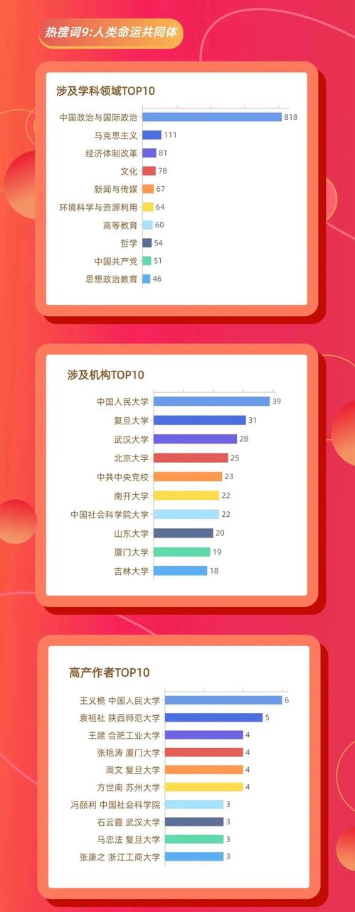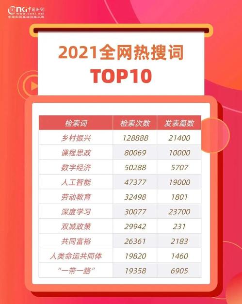 近日,CNKI社科学术邦以中国知网2021年文献大数据为基础,统计得出了2021年知网全网热搜词TOP10、各热搜词检索次数及相关学术论文篇数,进而根据论文产出数量统计得出了各热搜词相关论文产出机构TOP10、学科领域TOP10、作者TOP10。