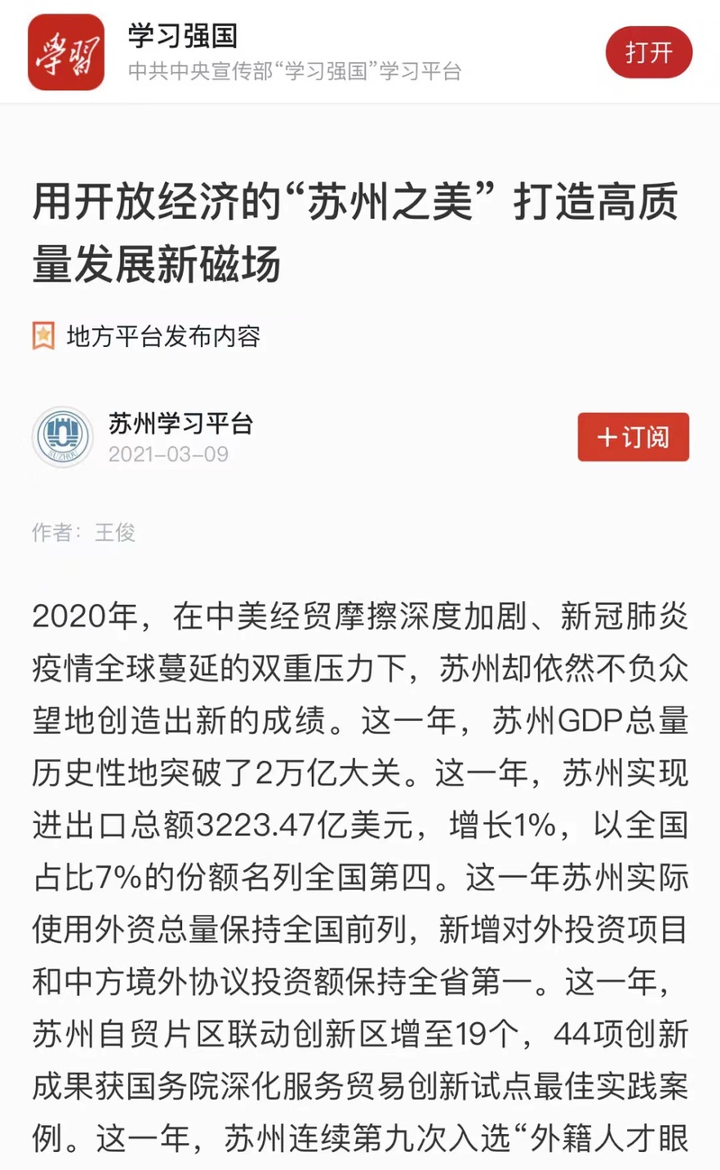 学习强国|王俊:用开放经济的“苏州之美” 打造高质量发展新磁场