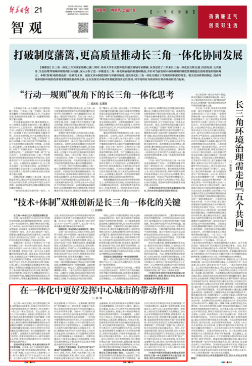 【编者按】长三角一体化上升为国家战略已满三周年,东吴智库组织相关领域专家在《新华日报》撰稿,认真总结了三年来长三角一体化在互联互通、经济发展、公共服务、生态治理等领域所取得的巨大成就,深入分析了进一步推进长三角一体化所面临的机遇和挑战,并针对当前发展中亟需破解的制度性难题提出值得借鉴的创新观点。这组文章从制度创新与突破的角度,提出深化长三角一体化关键在于实现政府职能的转变。相关经济政策的制定、营商环境和创新环境的改善要紧紧围绕着市场主体,充分发挥出市场对资源配置的决定性作用,科学地将有为政府和有效市场有机结合起来。本期推送东吴智库兼职研究员孙伟教授撰写的文章《在一体化中更好发挥中心城市的带动作用》,以飨读者。