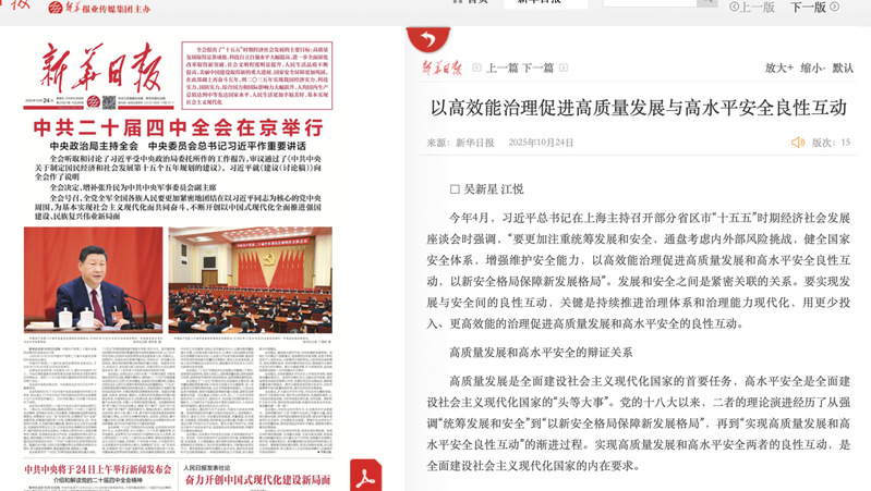 2025年10月24日,《新华日报》发表东吴智库吴新星研究员的理论文章《以高效能治理促进高质量发展与高水平安全良性互动》。文章深入剖析了高质量发展与高水平安全的辩证关系,指明高效能治理促进高质量发展和高水平安全良性互动的内在逻辑,提出“十五五”时期实现发展与安全间的良性互动,关键是持续推进治理体系和治理能力现代化,用更少投入、更高效能的治理促进高质量发展和高水平安全的良性互动。现将文章转载如下,以飨读者。