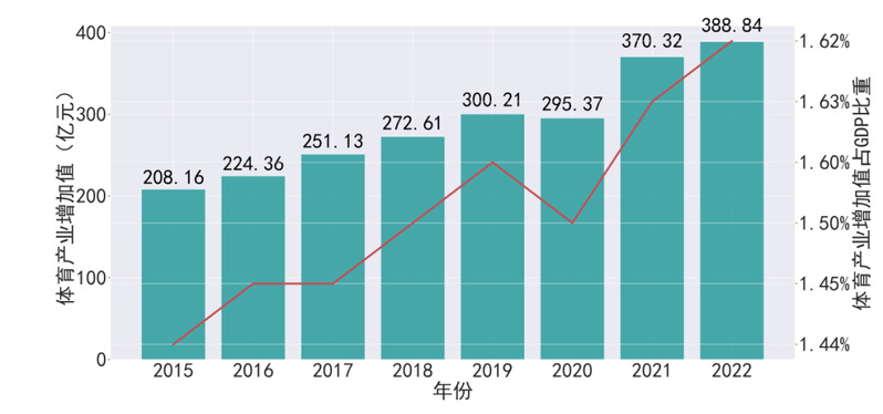 “十三五”期间,苏州市体育赛事活动蓬勃开展,产业规模稳步提升。体育及相关产业总规模从2015年的701.4亿元扩大至2020年的985.0亿元,增长了40.44%;产业增加值也从208.16亿元扩大至295.37亿元,增长了41.90%;人均体育场地面积也从3.16平方米/人增加至3.75平方米/人。随着苏州体育消费试点城市建设的开展,进一步推动了苏州市体育产业的发展。截至2022年底,苏州体育及相关产业总规模达1237.08亿元,增加值扩大至388.84亿元,体育产业增加值占GDP比重提升至1.62%,显示出巨大的体育经济潜能,苏州体育经济逐步呈现国民经济支柱性产业发展态势。“十四五”时期,苏州计划建成40余家体育产业示范基地,培育16个省级、40个市级具有一定影响力和知晓度的体育服务集聚区,培育一批集团型、连锁化品牌知名度高、国际化竞争力强、行业带动性大的体育企业,为助推赛事经济发展奠定了良好的产业基础。