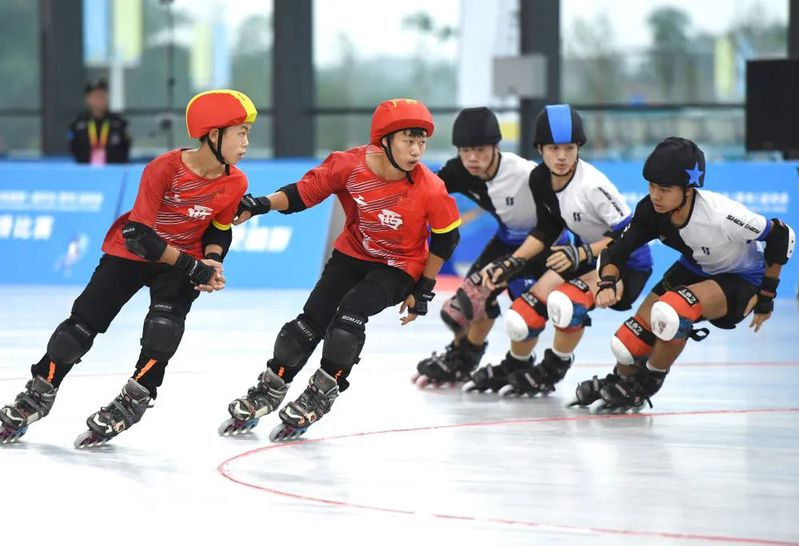 11月6日,在第一届全国学生(青年)运动会男子轮滑阻拦决赛中,南宁市队(左)以27:17战胜深圳市队,夺得冠军。新华社记者 周华 摄