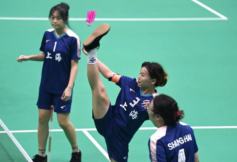 11月7日,上海队选手在第一届全国学生(青年)运动会毽球大学组女子三人赛一阶段比赛中进攻。新华社记者 周华 摄
