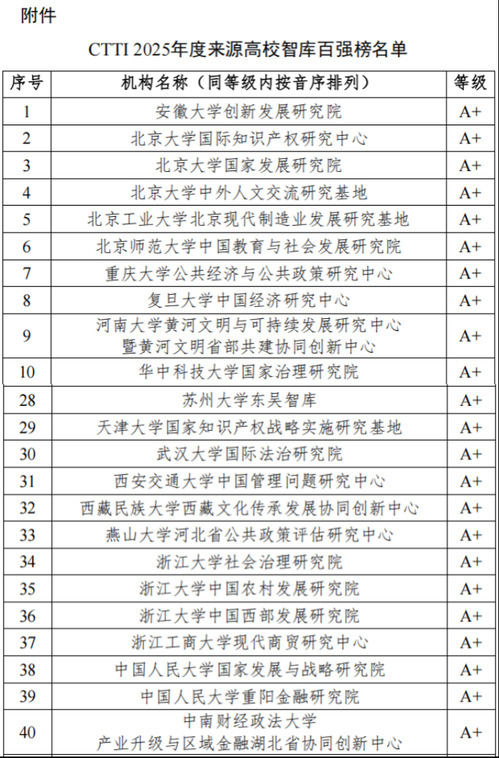 近日,南京大学中国智库研究与评价中心发布了2025年高校智库百强榜。东吴智库获评CTTI 2025年度高校百强智库A+等级。这是东吴智库继2022年获评高校智库百强榜A+等级后,再次入围百强榜并再次获得最高等级。