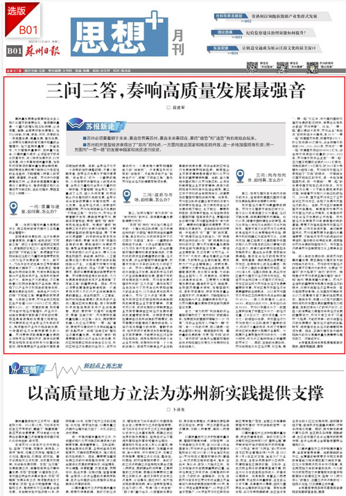 【编者按】11月28日,《苏州日报》刊登苏州大学东吴智库执行院长段进军教授的文章《三问三答,奏响高质量发展最强音》。文章针对“推动高质量发展”这一首要任务,从质量与速度、政府与市场、内向与外向三个维度解读苏州推进中国式现代化建设的新实践路径。现将全文转载如下,以飨读者。