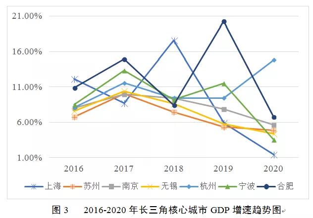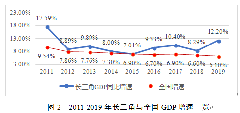 2020年,在新冠疫情冲击全球经济的背景下,中国经济增速一季度同比降低6个百分点,下半年我国经济开始复苏,世界银行预测在2021年中国将回升至7.9%。长三角区域坚持落实高质量发展要求,经济总体保持“稳中求进”的态势。总体来看长三角区域的经济增速整体处于放缓的趋势,2019年长三角地区的经济增速为12.2%,比2011年的经济增速降低约5个百分点,经济增速延续下行走势;横向来看,2019年,长三角区域经济增速比全国高约6.2个百分点,实现了较快增长,长期来看长三角区域与全国经济增速的差距呈缩小趋势。