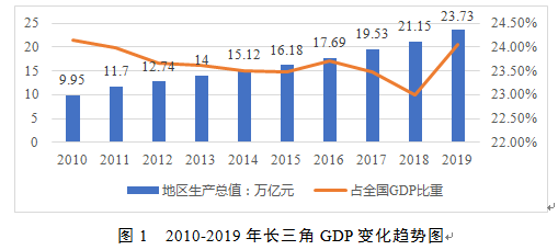 2019年,长三角的地区生产总值约为23.73万亿元,占全国经济总量的24%,经济增速高于全国6个百分点。长三角区域土地面积约占全国的1/50,但产出了全国近1/4的经济总量。在2020年全球经济下滑的背景下,长三角区域经济展现了充分的韧性,总体发展水平在全国处于领先地位,是支撑和引领我国区域经济发展的新引擎。