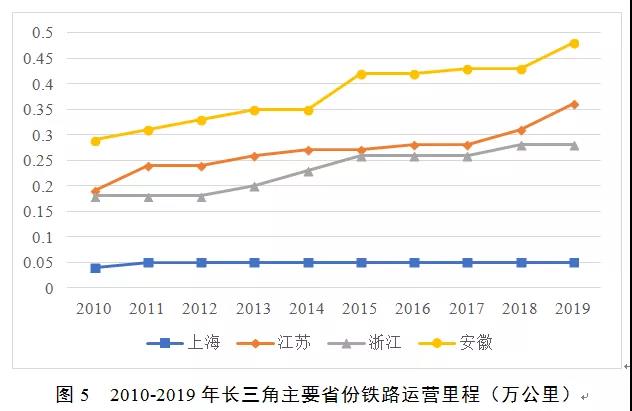 据国家铁路局数据,自2010至2019年长三角主要省份的铁路运营里程呈不断上升的趋势,但区域间铁路交通网密度差异较大。随着高铁网络不断延伸,以安徽合肥为中心的“米字型”高速铁路运输网络与长三角地区的大多城市已实现基本覆盖,安徽至上海、南京、杭州都市圈的快速客运大通道基本实现贯通,与江浙沪形成“2小时高铁出行圈”,同城化效应显著。