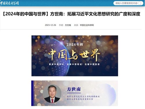【编者按】近日,中国社会科学网发布苏州大学东吴智库首席专家方世南教授的文章《拓展习近平文化思想研究的广度和深度》。文章论述了作者将如何在2024年围绕习近平文化思想进行更加全面而深入的研究,力争在拓展习近平文化思想研究的广度和深度上取得新进展。现将全文转载如下,以飨读者。