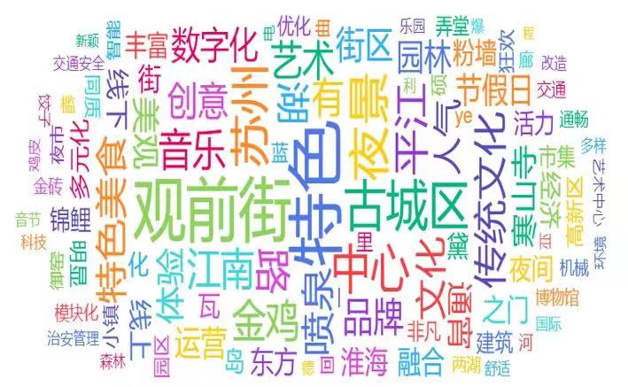 课题组从线上社交平台(如新浪微博)筛选出约2000条包含“苏州”“夜间经济”等关键词的微博文本,得到词频数位于前100名的词云(见图1)。通过高频关键词的数据挖掘,发现市民对苏州夜间经济关注点涉及五项主题。一是交通。“交通便利”频数达到331,意味着夜间交通便捷对消费有很大影响。二是业态。“高品质”“多样化”的频数高达288,表明人们更喜欢消费目的地周边涵盖到多种功能业态。三是文艺。“创意”“时尚”“艺术”高频出现,表明市民夜间消费活动更容易被文艺气息所吸引。四是姑苏文化。“人气特色街区”、“古城区夜景”和“江南传统文化”高频提及,说明无论是老苏州人,还是新苏州人,都对姑苏历史文化怀有浓郁情感。五是社交。“节假日通宵运营”和“酒吧一条街”的频数均超过150,表明市民夜间消费的主要动机是增加社会交往。
