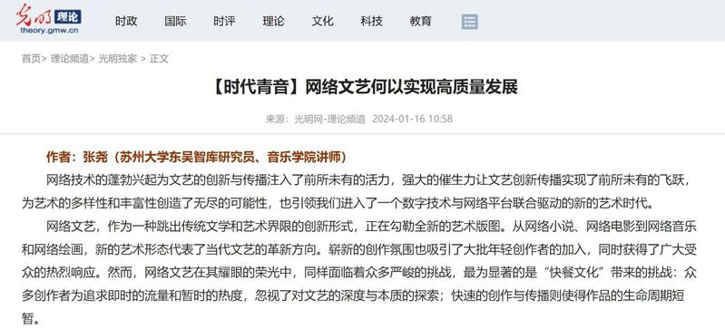 【编者按】2024年1月16日,《光明网》“理论频道”在线刊登苏州大学东吴智库研究员张尧的文章《网络文艺何以实现高质量发展》。文章聚焦网络技术的蓬勃兴起对文艺创新与传播的影响,提出了促进高质量网络文艺作品广泛传播和社会认同的路径做法。现将全文转载如下,以飨读者。