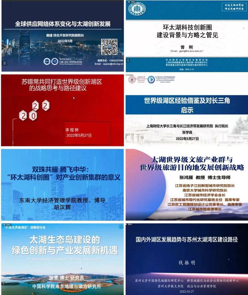 会议主旨演讲阶段,各位专家从不同角度、不同层面、不同领域,为苏州“打造太湖世界级湖区”建言献策。曲建研究员围绕“全球供应网络体系变化与太湖创新发展”,分析太湖世界级创新生态圈的战略定位,并提出苏州打造太湖世界级湖区,要重点关注科技创新模式、科技创新环节、现代产业体系、产业发展园区以及规划发展战略五个方面。曾刚教授以“环太湖科技创新圈建设背景与方略之管见”为主题,基于环太湖科技创新圈建设背景和产业现状,提出苏州打造环太湖科技创新圈要重视环太湖顶层设计,推进跨界产学研一体化,设立政府间科创合作特区。张学良教授以“世界级湖区发展经验借鉴及对长三角启示”为主题,借鉴多个国家的世界级湖区在开发与保护、传承与创新、湖与镇协同开发、完善基础服务、汇集智力资源等五个方面的经验,提出了打造世界级湖区要秉持高水平开放、高质量发展、高品质生活、高效能治理的“四高”发展路径。胡汉辉教授围绕“双珠共耀 腾飞中华:‘环太湖科创圈’对产业创新集群的意义”,提出环太湖科创圈建设的历史使命一方面是整合和重组苏州十大组团创新资源,形成苏州特色、长三角中心区域的创新高原;另一方面通过体现未来和新兴科技的产业创新成果,引领和支撑整个苏州乃至长三角,辐射全国的产业创新集群的发展。张鸿雁教授围绕“太湖世界级文旅产业群与世界级旅游目的地发展战略创新战略”,分析世界级湖区总体发展趋势及时代变迁,结合苏州政策、交通、生态、产业、文旅、文化等优势,提出了十二条创新突破路径。陈雯研究员聚焦“太湖生态岛建设的绿色创新与产业发展新机遇”,以生态文明与生态创新发展方向为切入点,详细介绍太湖生态岛的功能定位,全面阐述了提升生态环境、建设生态村镇、发展生态经济的三大湖区发展策略。李程骅教授聚焦“苏锡常共同打造世界级创新湖区的战略思考与路径建议”,从长三角一体化的视角强调建立共建机制跨区域协同发展的重要性。他指出,苏州要瞄准国际一流创新型城市的建设目标,在打造世界级科创湖区中发挥引领示范作用,绘出“大湖大城”的新场景。钱振明教授以“国内外湖区发展趋势与苏州太湖湾区建设路径”为主题,从世界形势、中国大势、周边声势、苏州优势、未来趋势、可行态势六个方面强调将苏州太湖打造成为世界级湖区的必要性,并提出苏州太湖发展要重视整体规划和产业定位、资源共享和错位发展、市级推动和协同开发、主动承接和融入上海、人才集聚和模式创新、国资引导和社会合作。