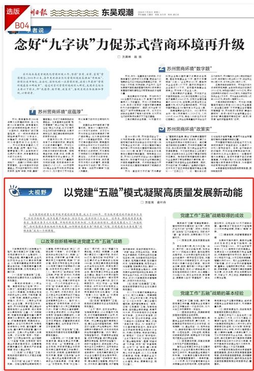 【编者按】1月30日,《苏州日报》刊登苏州大学东吴智库首席专家方世南等的文章《以党建“五融”模式凝聚高质量发展新动能》。文章基于太訸集团建设发展进入“加速时期”需要面对的党建业务“两张皮”问题,以及党建与业务发展“同频共振”这一新课题,提出以改革创新精神推进党建工作“五融”战略,并从实施方式、所得成效与基本经验三方面展开具体阐释。现将全文转载如下,以飨读者。